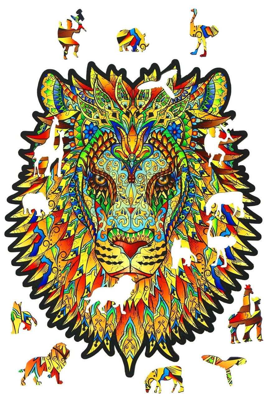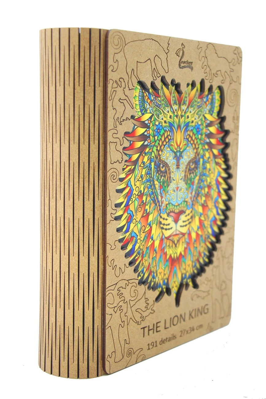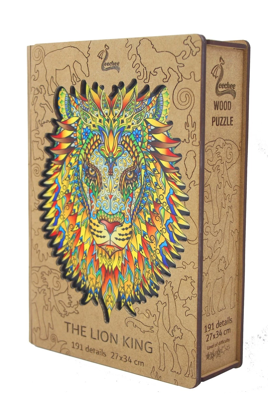 Фигурный деревянный пазл The Lion King от компании Leechee - прекрасная зарядка для ума и увлекательное времяпровождение в домашней обстановке. Он изготовлен из экологически чистого материала, а именно, сертифицированной светлой древесины без искусственных добавок. Картинка отличается яркой высококачественной печатью, приятным природным ароматом и элементами самой необычной формы. Пазл в виде животного будет оценен по достоинству детьми и взрослыми. Изображение льва - царя зверей смотрится очень интересно в авторском дизайнерском оформлении. У него четко выделяются глаза, нос, пасть, аккуратно прорисована форма мордочки. К тому же, это не просто лев с роскошной гривой, а разноцветный зверь, состоящий из массы силуэтов, своих "подчиненных". Разбирая пазлы, вы найдете маленькие причудливые фигурки жирафа, страуса, слона, кота, птиц в полете, маски индусов и другие изображения. Данный пазл вам позволит отвлечься от неприятных мыслей, снимет усталость и раздражение, позволит успокоиться и отправиться в мир дикой природы. Креатив заключается в том, что каждый пазлик уникален и не похож на рядом стоящий. Такая нестандартная форма деталей очень понравится детям и непременно вызовет интерес собрать картинку до конца! Пазл вобрал в себя очень много цветов и оттенков. Обратная сторона также имеет уникальный рисунок с оригинальной сюжетной линией. Когда пазл лев будет полностью собран, вы сможете по достоинству оценить креативность мышления создателей. Роскошный подарок к любому празднику! Пазл из дерева the lion king послужит прекрасным подарком близкому человеку. Он не только уникален по своему исполнению, но и упакован в презентабельную деревянную коробочку. Благодаря качественно выполненной упаковке детали не растеряются и не потеряют свой первоначальный вид долгие годы. Покупая данный пазл, будьте уверены, что вы приобретаете настоящий авторский рисунок!
