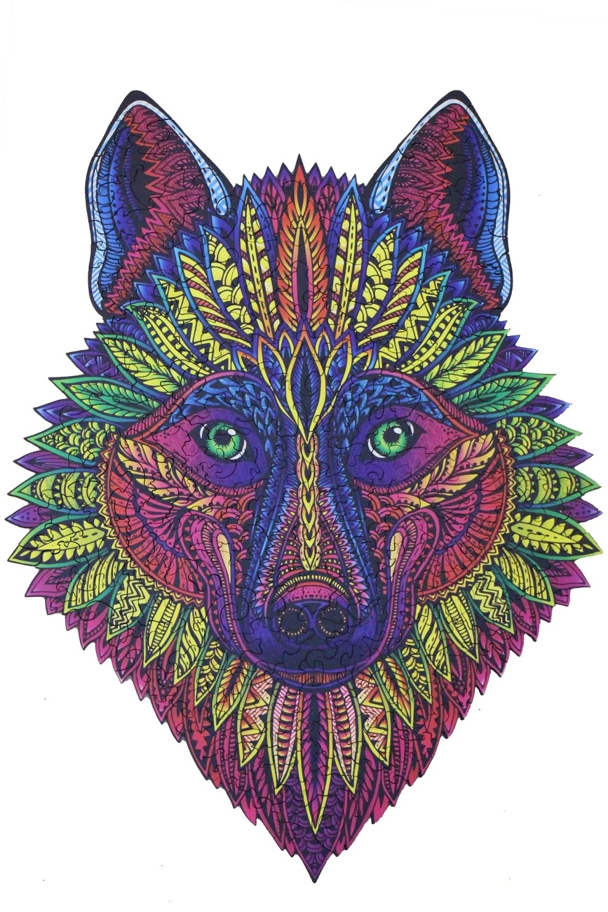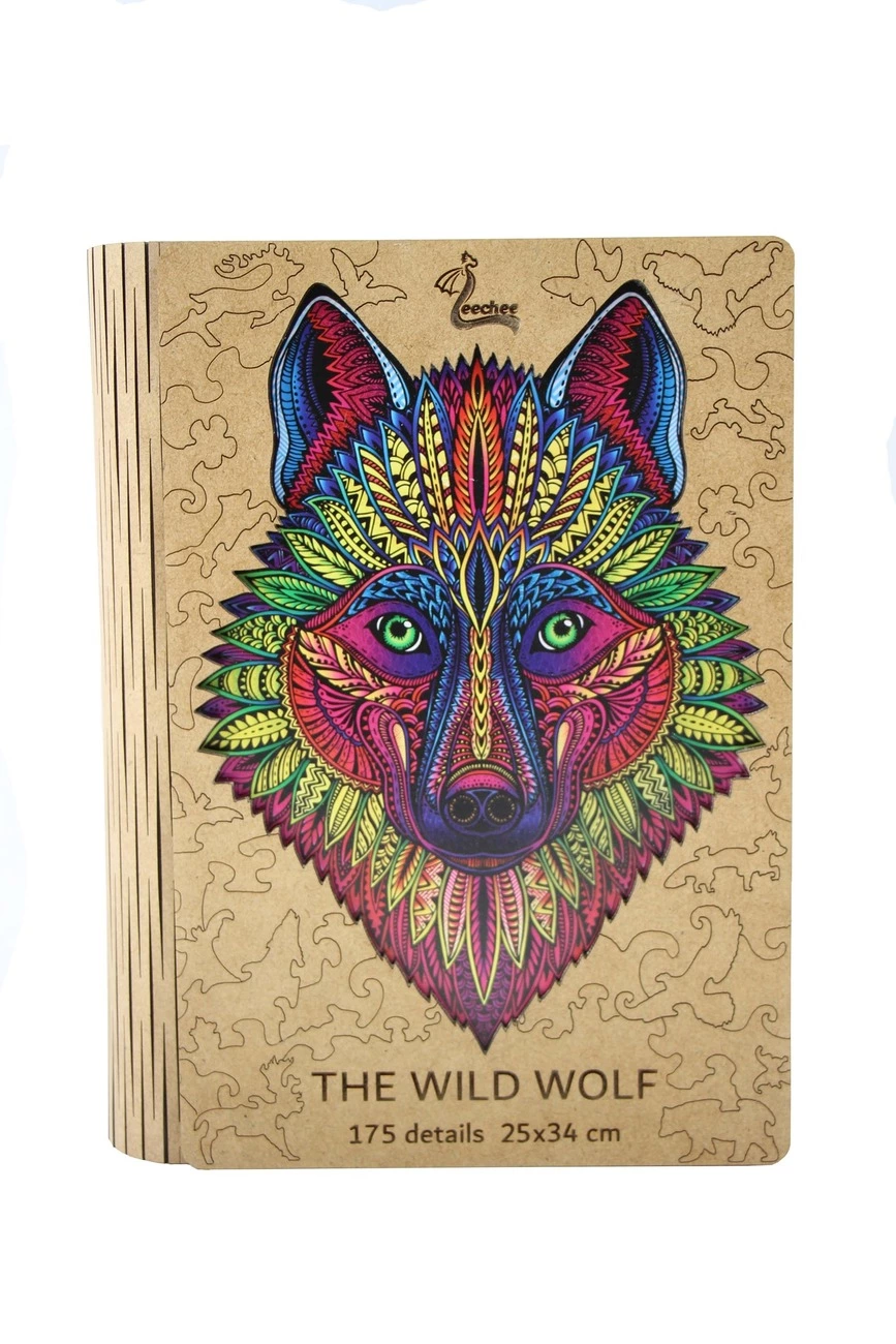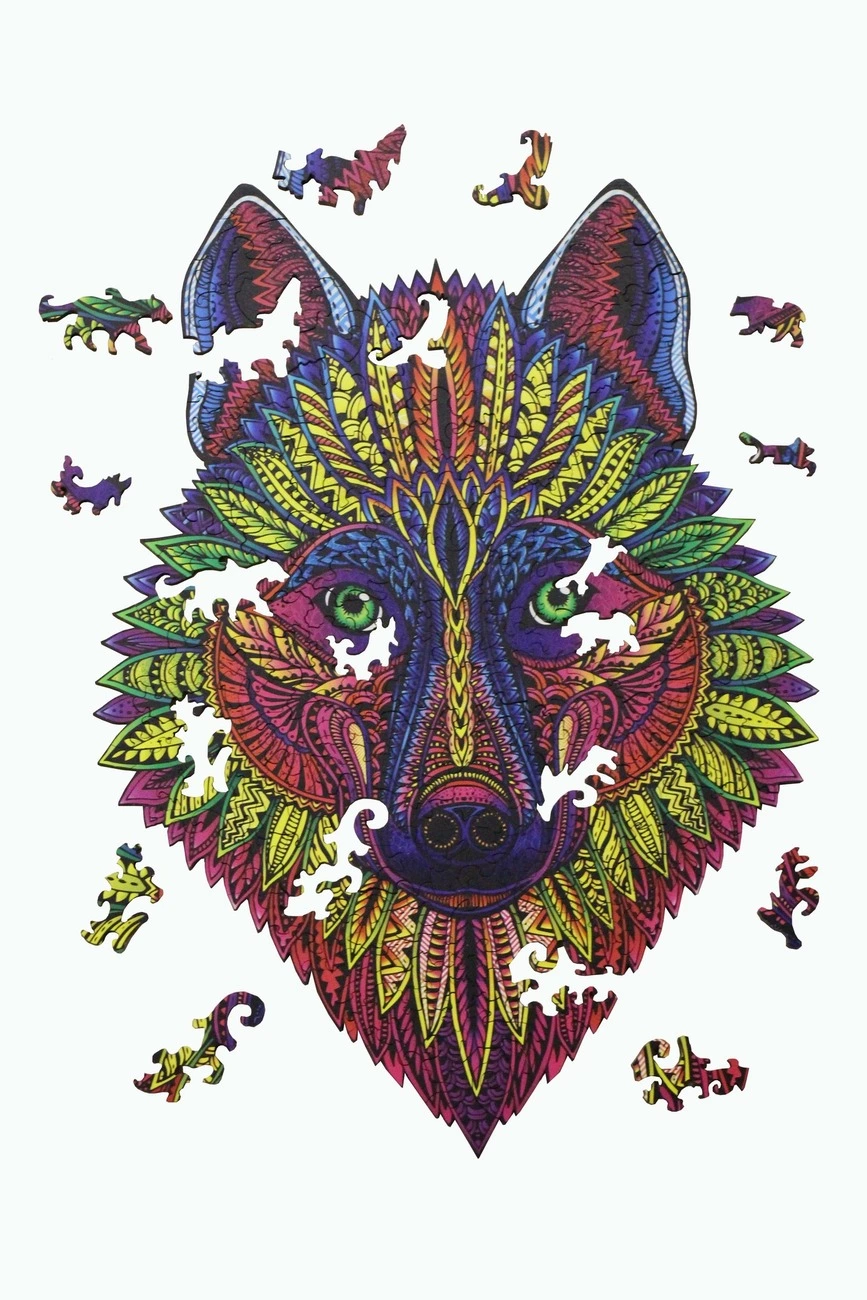 Деревянный пазл The Wild wolf - приглашение отправится в увлекательное сказочное путешествие. Красивая головоломка поможет расслабиться, забыть о проблемах и заботах. Прекрасный способ снять стресс, сконцентрировать внимание на создании настоящего чуда своими руками. Происходит магия - из разноцветных кусочков мозаики начинает, как по волшебству, появляться добрый, загадочный волк с изумрудными глазами. Тотем благородства, силы, мужества. Рисунок напоминает талисман индейцев, созданный из ярких, изящных пёрышек экзотических птиц. Таинственные узоры складываются в лохматую голову доброго волка. Такой оригинальный и необычный подарок станет приятным сюрпризом и для взрослых, и для детей. Настоящий праздник приятных эмоций Этот пазл с животным отличается оригинальным сочетанием цветов и оттенков, увлекательной сюжетной линией двусторонней картинки. Насыщенные краски рисунка в фиолетово-бордовой и желто-зеленой гамме настраивают на позитив, душевное спокойствие и равновесие. Тонкие графические линии, комбинации оттенков, необычная форма узора в этническом стиле Южной Америки увлекает, заставляет забыть о реальности. Такой изящный, умный подарок не даст скучать. На обратной стороне головы чудесного красочного волка более сложный авторский рисунок. Густой лес с таинственной тропинкой, которую охраняет волк, выполнен в технике черно-белой графики. А что таится в этом загадочном лесу - об этом есть время подумать, собирая головоломку. Настоящий вызов для профессионалов, которые оценят повышенную сложность составления картинки. Пазл из дерева дарит естественную теплоту и приятные ощущения. Миниатюрные детали приятны на ощупь, шероховатая текстура и аромат древесины напоминает о лесе, отдыхе, беззаботном спокойствии. Каждая деталь в форме животного, цветка, рыбки, растения уникальна и неповторима, ее хочется рассматривать и изучать часами. Пазл для взрослых - отличный способ отвлечься. Чтобы собрать сложную картинку, из огромного количества деталей, нужно полностью сконцентрироваться на процессе, постепенно погружаясь в удивительный мир фантазий и трансформаций. Оригинальные авторские деревянные пазлы для взрослых в шикарной дизайнерской упаковке из дерева оригинальный, стильный, универсальный подарок к любому празднику. Отличное решение для отдыха вечером или в праздничные дни.